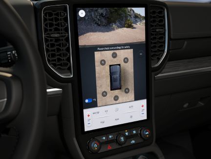 Màn hình cảm ứng quan sát địa hình trên Everest giúp cho người lái có thể xem đồng thời camera trước, lớp đồ họa, hiển thị độ nghiêng và dốc của xe và dễ dàng kích hoạt các tính năng như khóa vi sai.