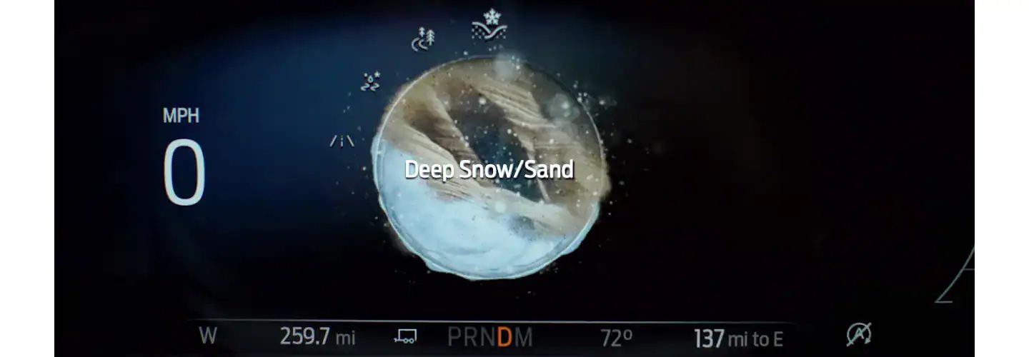 Chế độ vận hành trên đường cát/ tuyết dày hỗ trợ điều chỉnh thời điểm chuyển số, độ nhạy của chân ga, hệ thống kiểm soát lực kéo và tỷ lệ truyền lực để tối ưu hoạt động trên địa hình tuyết dày hay cát.