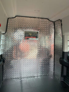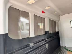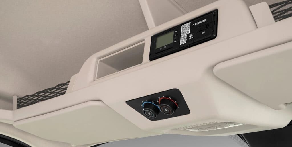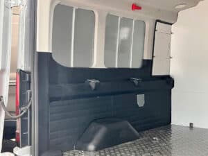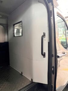 Vách ngăn giữa khoang lái và thùng hàng làm bằng Alu – khung thép 3 lớp chịu lực, có thiết kế cửa sổ phụ.