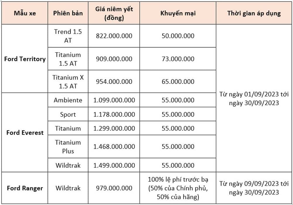 Theo thông tin được đăng tải trên website chính thức, Ford Việt Nam hiện đang triển khai chương trình ưu đãi cho 3 mẫu xe là Territory, Ranger và Everest.